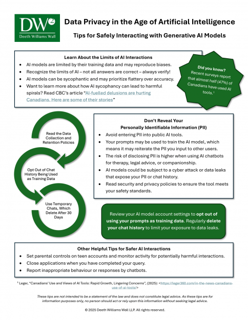Deeth Williams Wall LLP understands the importance of cyber education in today’s technology-driven world and encourages organizations and individuals to learn more about their digital security. To play our part this Cyber Security Awareness Month, here are our Tips for Interacting Safely with Generative AI Models.